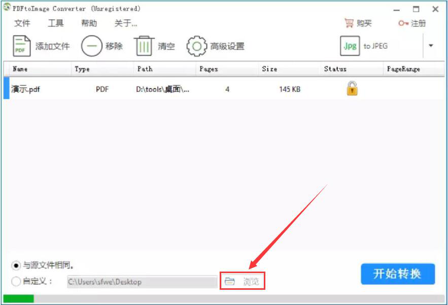 4、如果PDF文件转换为JPG后的输出路径需要更改,就点击PDFtoImage Converter操作界面下方的“浏览”按钮。