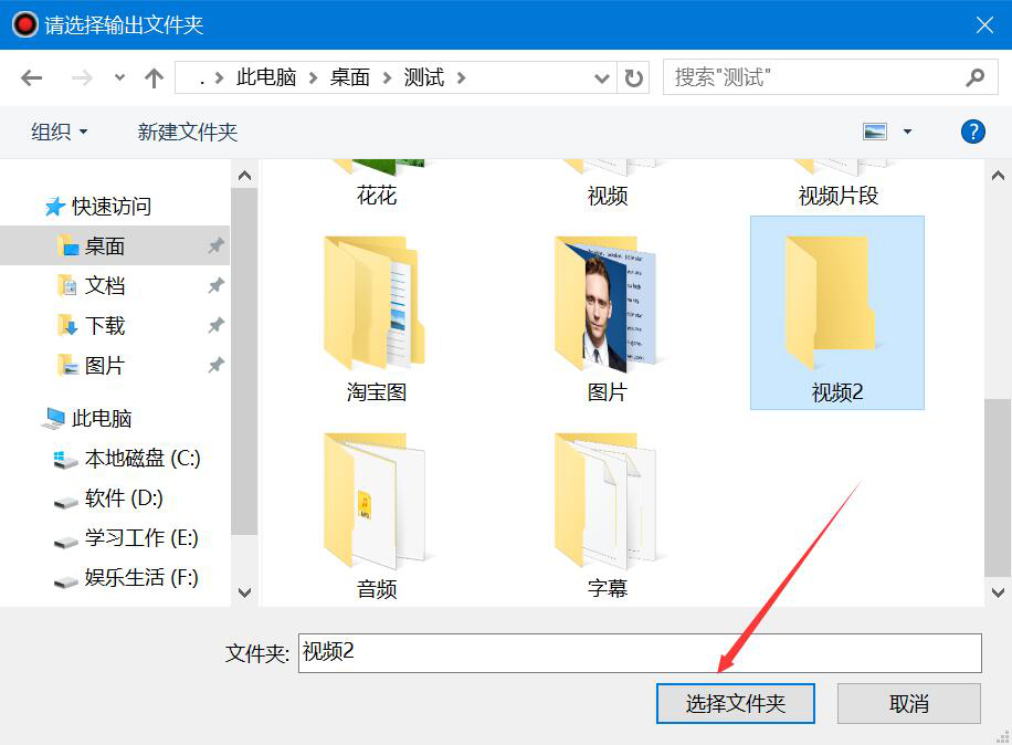 2、在弹出的窗口中,我们设置Bandisoft Bandicam录制电脑屏幕的视频保存路径,并点击“选择文件夹”按钮。