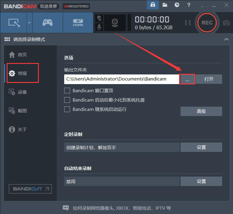 1、首先,我们打开Bandisoft Bandicam软件,切换至“常规”界面,设置录制电脑屏幕后的视频保存路径,点击如下图的“…”按钮。