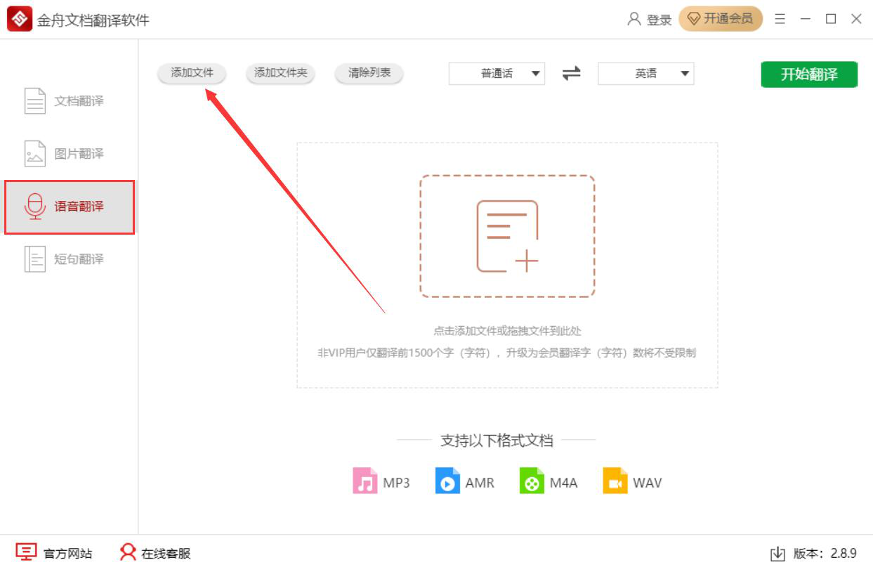 1、首先,我们打开金舟文档翻译软件,先切换至它的“语音翻译”操作界面,并点击界面左上方的“添加文件”按钮。