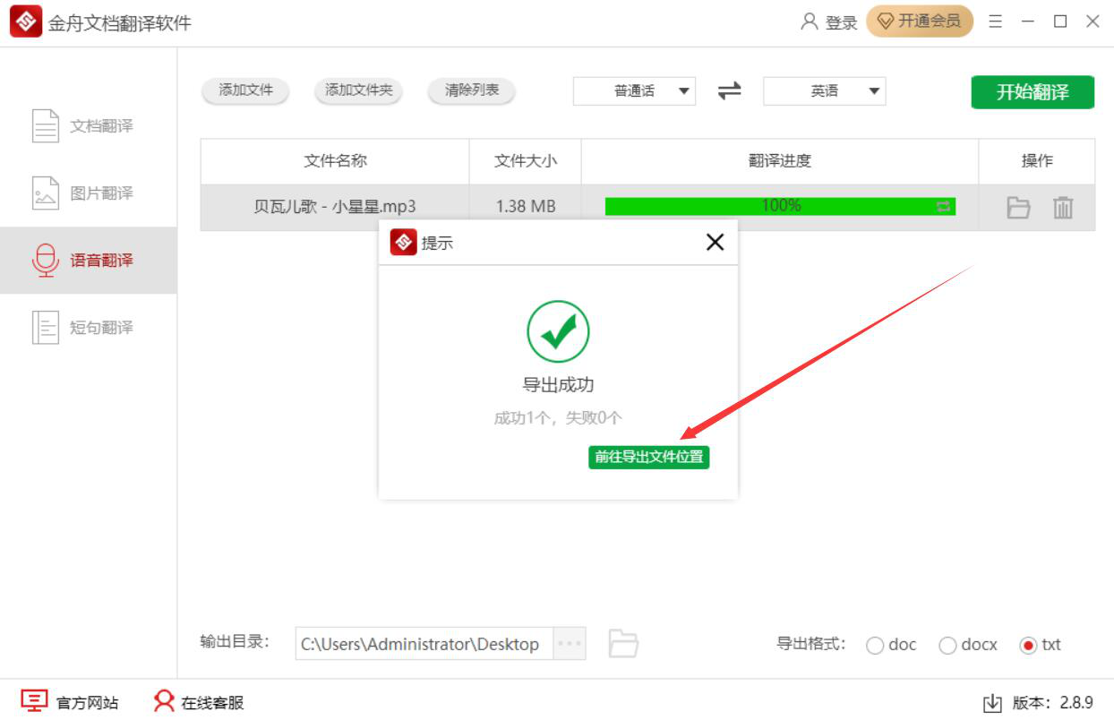 8、最后,弹出如下图的小窗口提示,则说明金舟文档翻译软件成功地翻译了语音。我们点击“前往导出文件位置”按钮,便可以快速找到翻译后的结果文件。