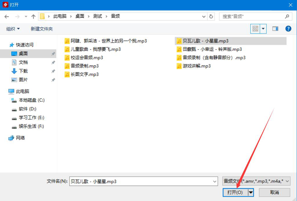 2、在弹出的窗口中,我们选择需要金舟文档翻译软件翻译的语音文件,并点击“打开”按钮。