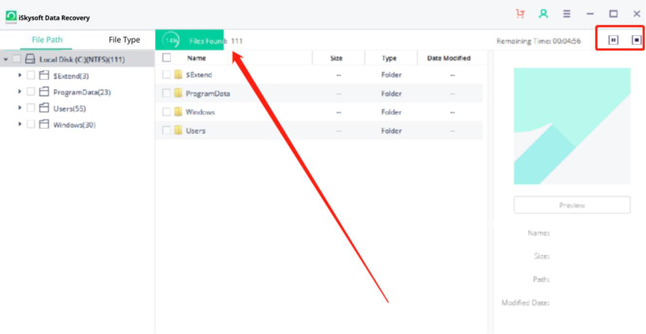 2、然后,我们在界面中可以看到iSkysoft Data Recovery正在扫描刚才所选的磁盘,如果想要恢复的文件被扫描出来了,可以点击界面右上方的停止按钮。