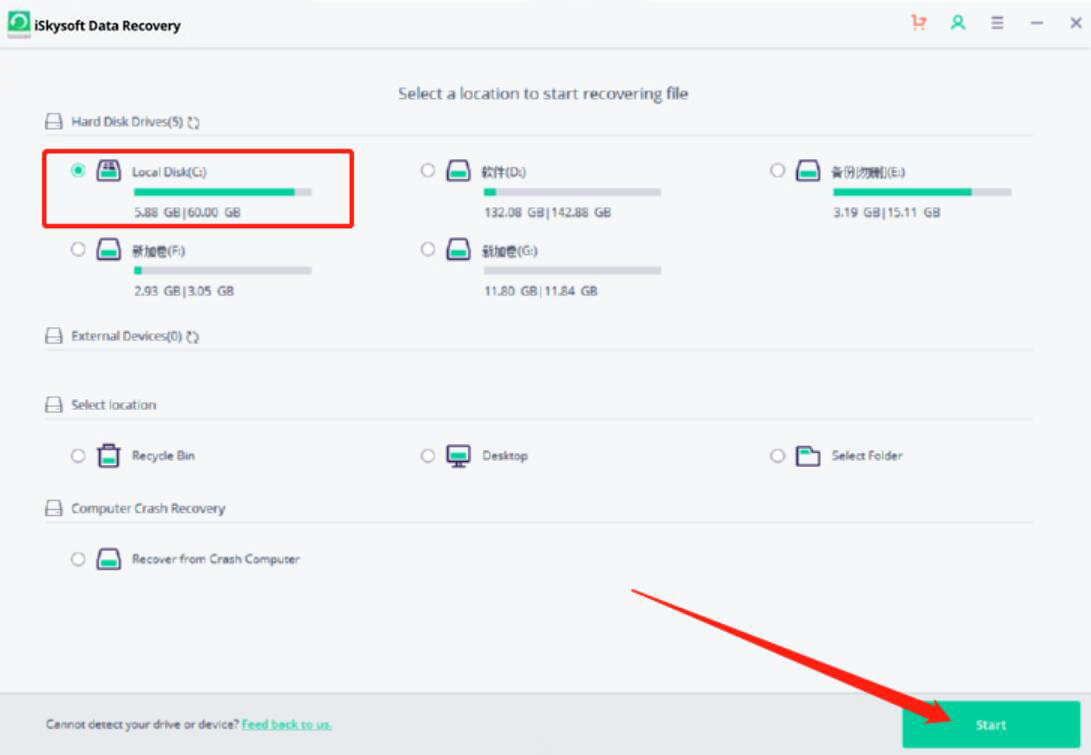 1、首先,我们打开iSkysoft Data Recovery,点击自己想要恢复的文件所在的磁盘,再点击“Start”按钮。