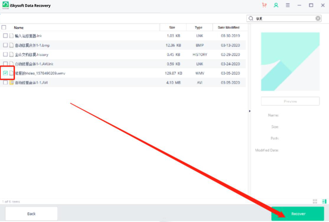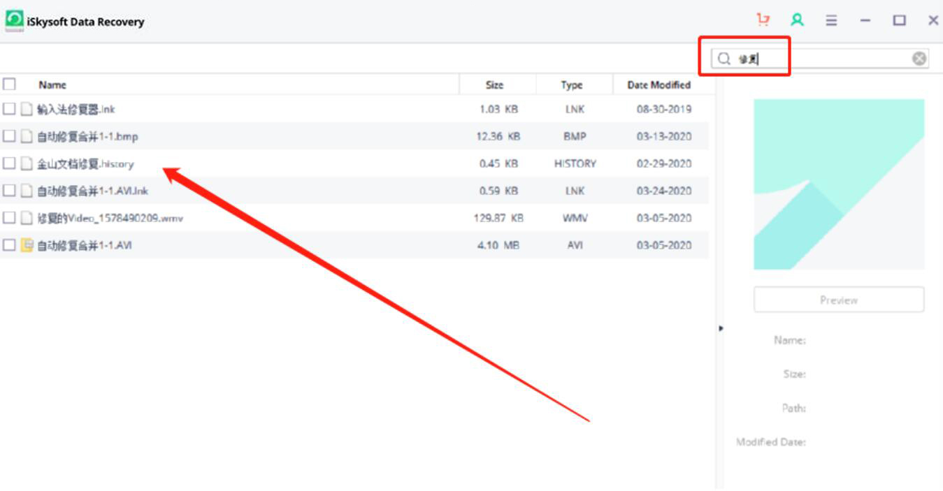 4、如果文件比较多,找起来比较困难,就可以在iSkysoft Data Recovery的界面右上方的搜索框中输入想要恢复的文件的关键词,再按回车键,iSkysoft Data Recovery便会将和包含该关键词的文件都检索出来,如下图所示。