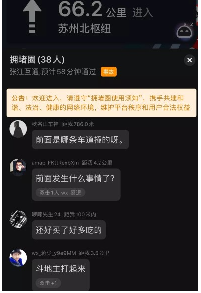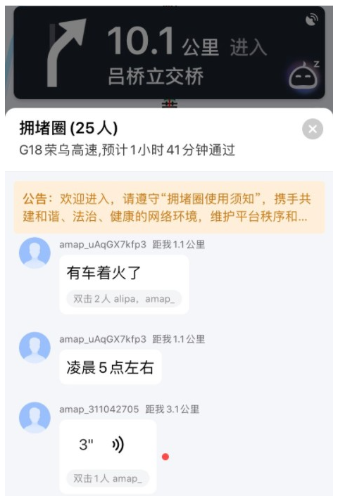 如果你在行车过程中使用高德地图进行导航,一旦进入拥堵路段,地图上会有“拥堵圈”的标识,点击进入,从而实现群聊。