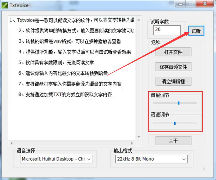 4、语言和输出格式都设置好了后,我们根据自己的需要调节音量、语速,再点击“试听”按钮试听文字转语音的效果。
