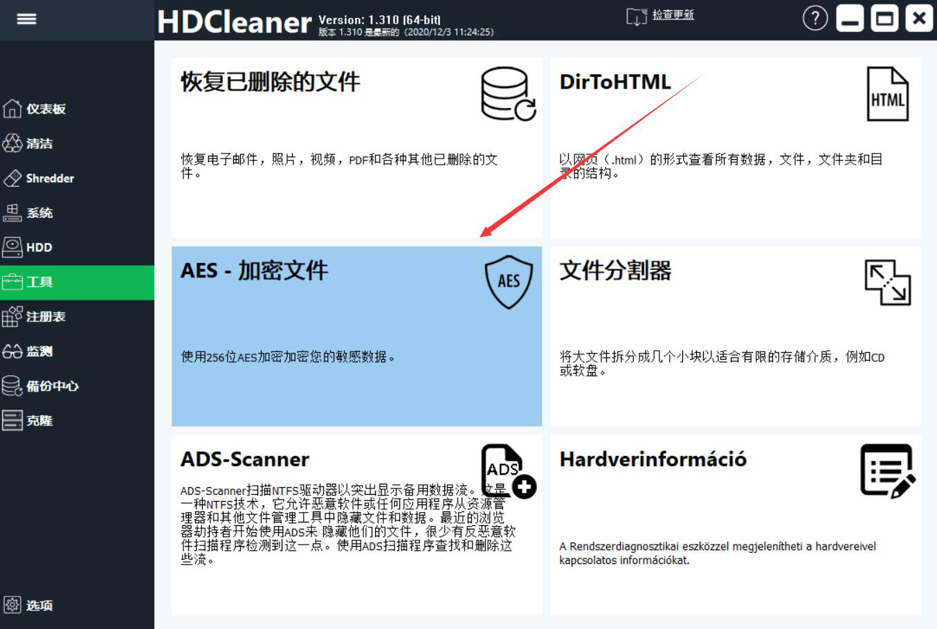 1、首先,我们打开HDCleaner,先切换至它的“工具”操作界面,点击工具列表中的“AES-加密文件”选项。
