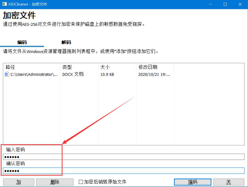 4、接下来,回到HDCleaner加密文件的操作窗口,在窗口左下方输入文件密码,如下图所示。
