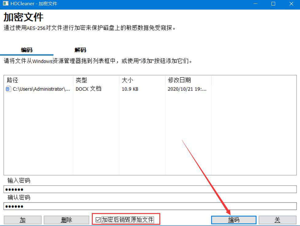 5、给电脑文件设置的密码输入完成后,想要将源文件销毁的话,就可以勾选“加密后销毁原始文件”,再点击“编码”按钮。