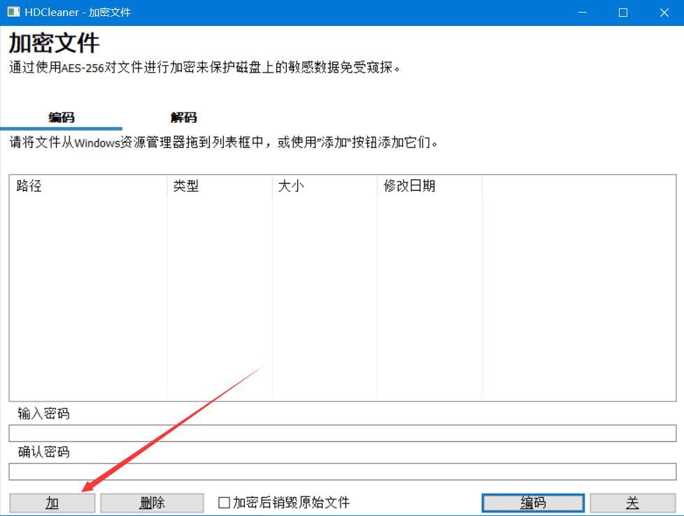 2、然后,我们进入HDCleaner加密文件的操作窗口,点击窗口左下方的“加”按钮。