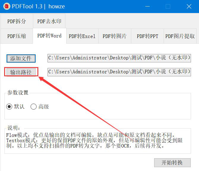 3、然后,我们回到PDF转Word操作界面,点击“输出路径”按钮。
