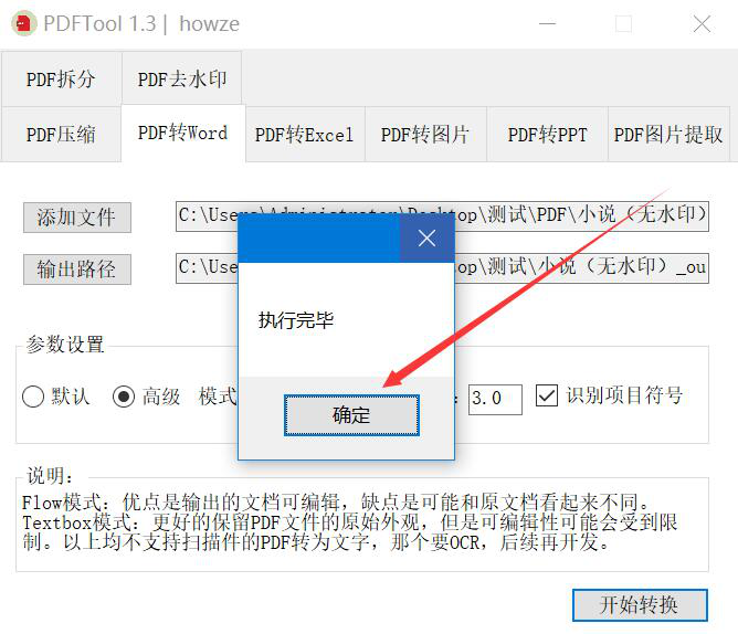 7、最后,如果PDFTool弹出如下图窗口提示,则说明PDFTool成功地将PDF文件转换成Word,直接点击“确定”按钮即可。