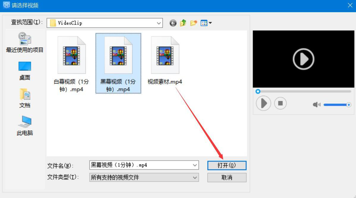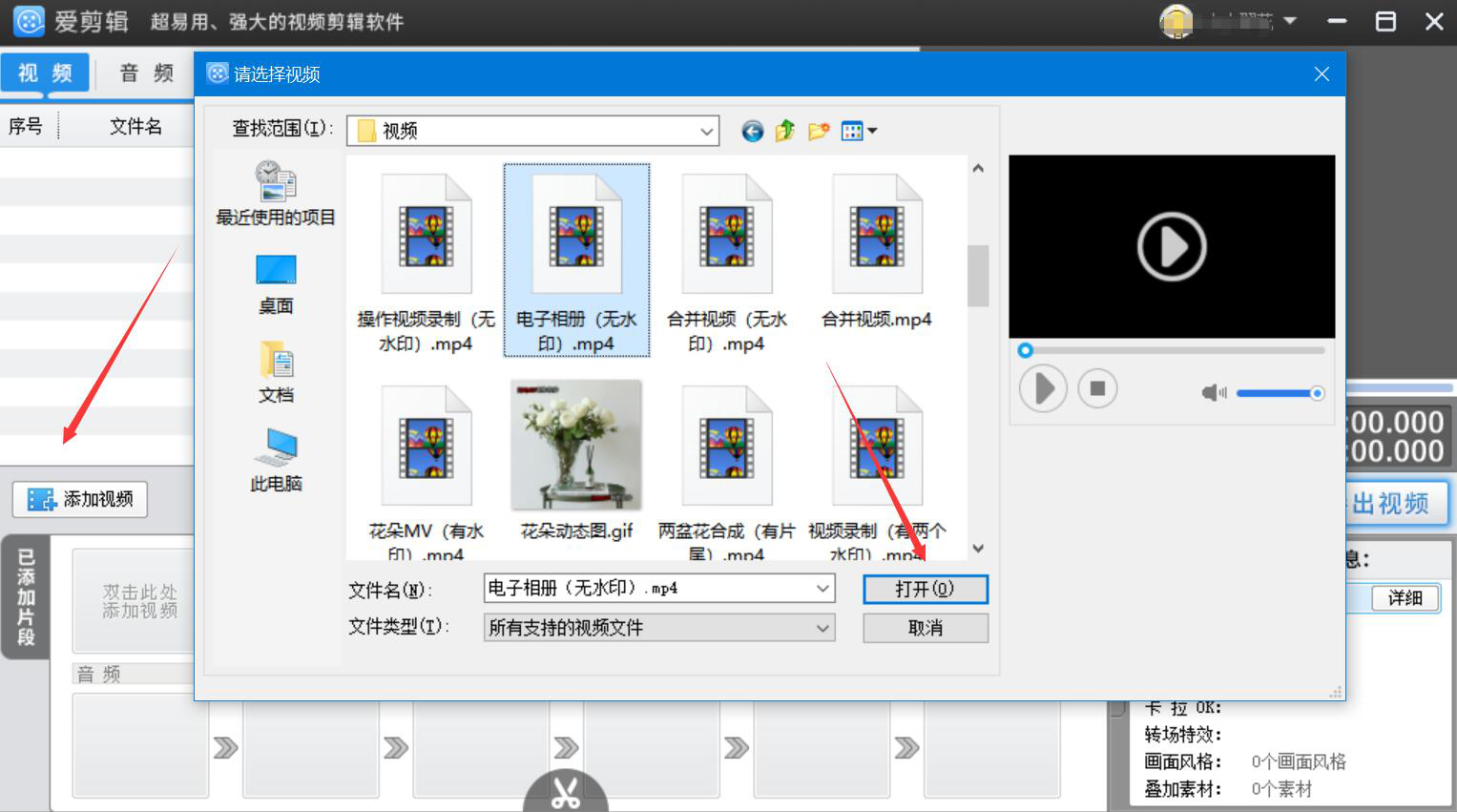 2、然后,在弹出的窗口中,我们选择制作电子相册时会用到的片头视频,点击“打开”按钮,将其导入爱剪辑。