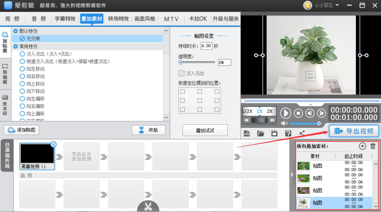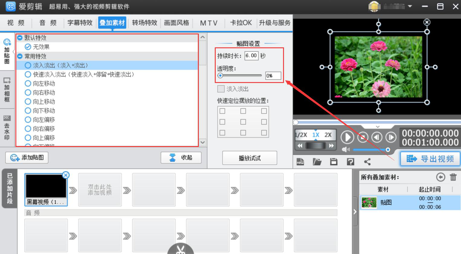 7、接下来,我们可以在加贴图功能中点击应用自己喜欢的特效,并设置图片播放的持续时长,这里设置为6秒。此外,还可以设置图片的透明度。