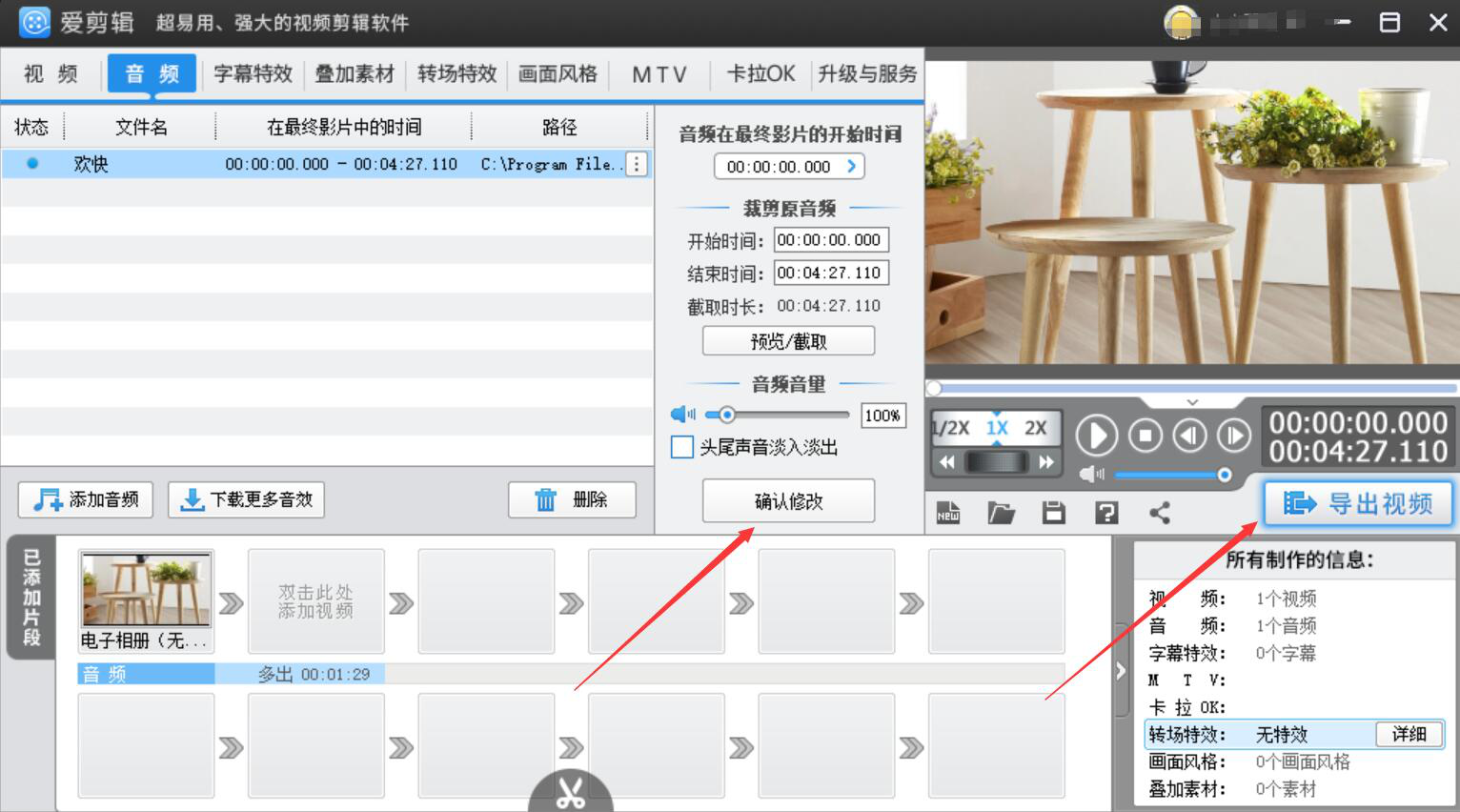 11、最后,我们根据自己的需要设置音频的播放时长,再点击“确认修改”按钮对操作进行保存,并点击“导出视频”按钮,爱剪辑便会将添加了背景音乐的电子相册导出到指定的路径。