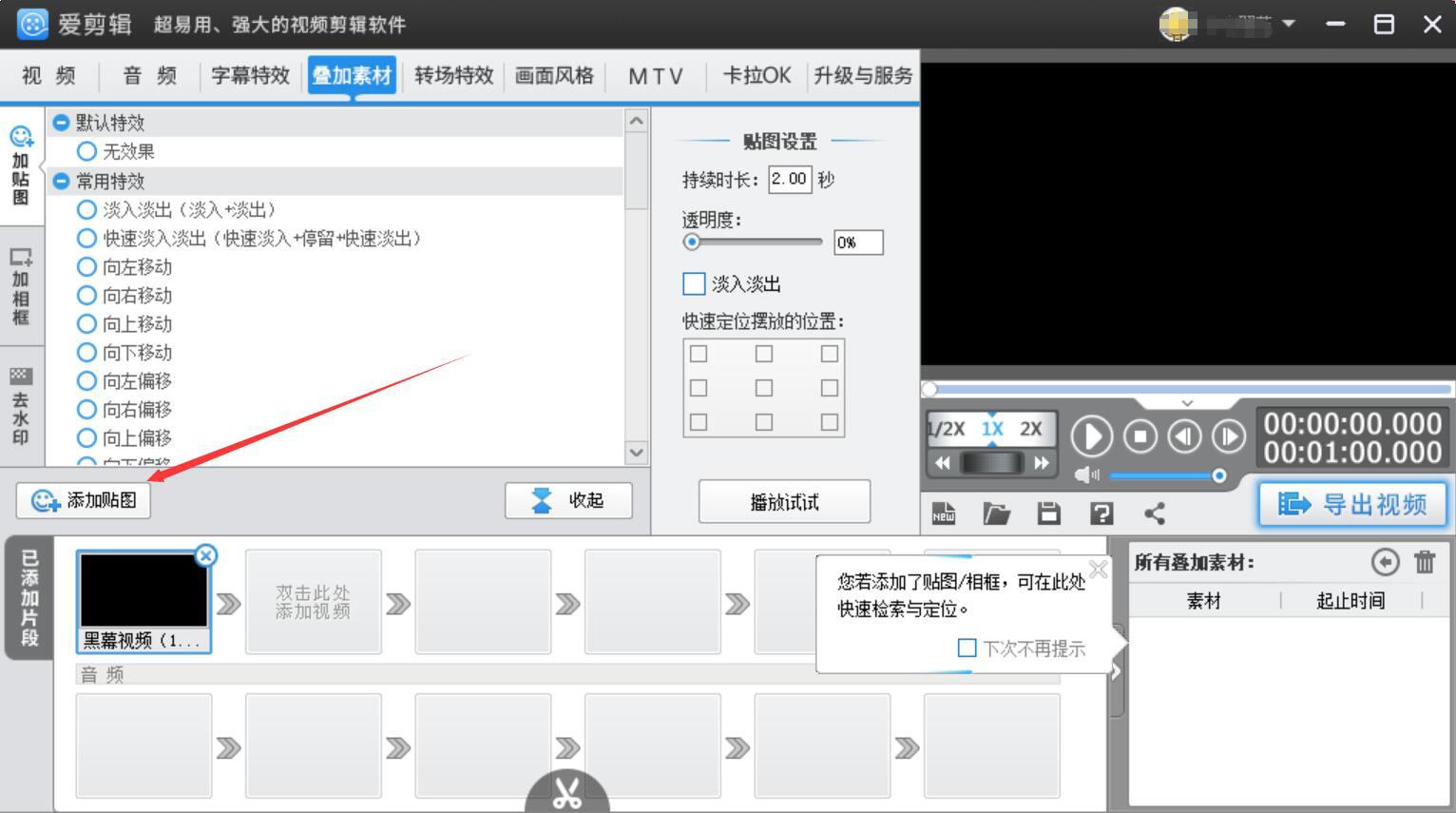 3、我们点击切换至“叠加素材”操作界面,再点击爱剪辑界面左侧的“添加贴图”按钮。