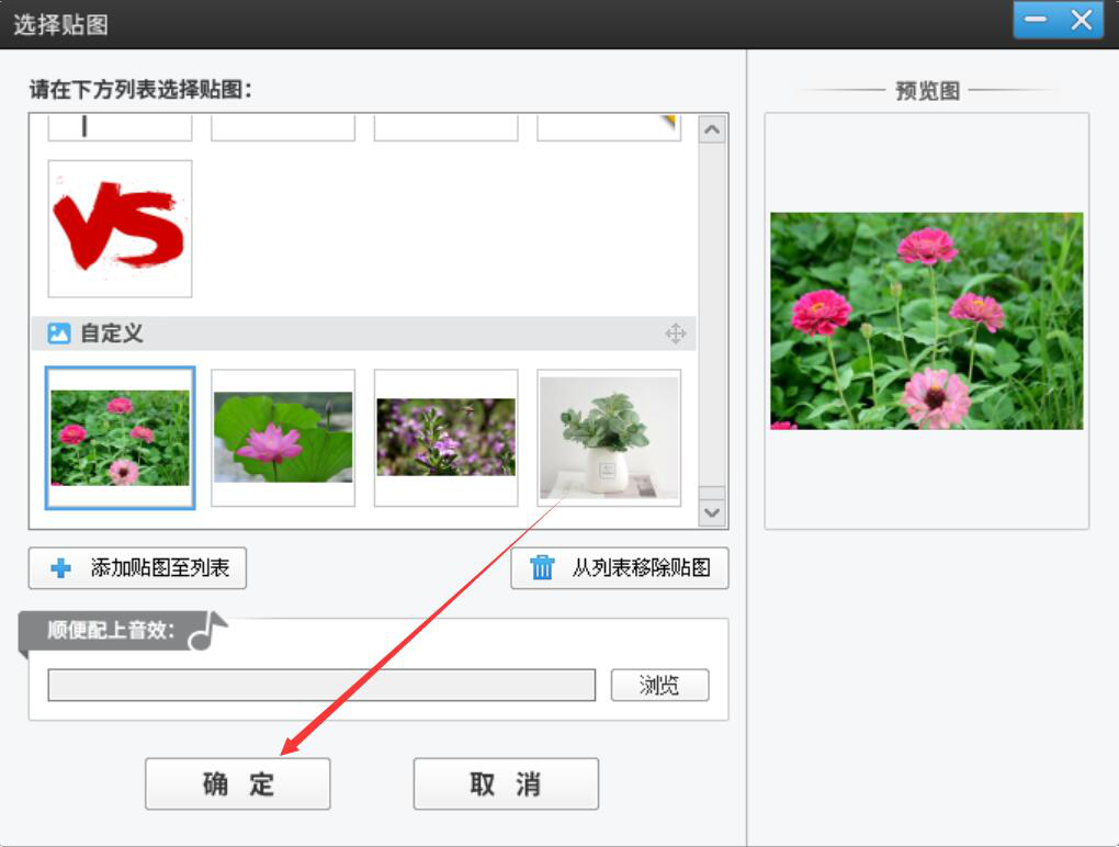 6、回到爱剪辑的选择贴图窗口,我们先选中导入的第一张图片,再点击“确定”按钮。