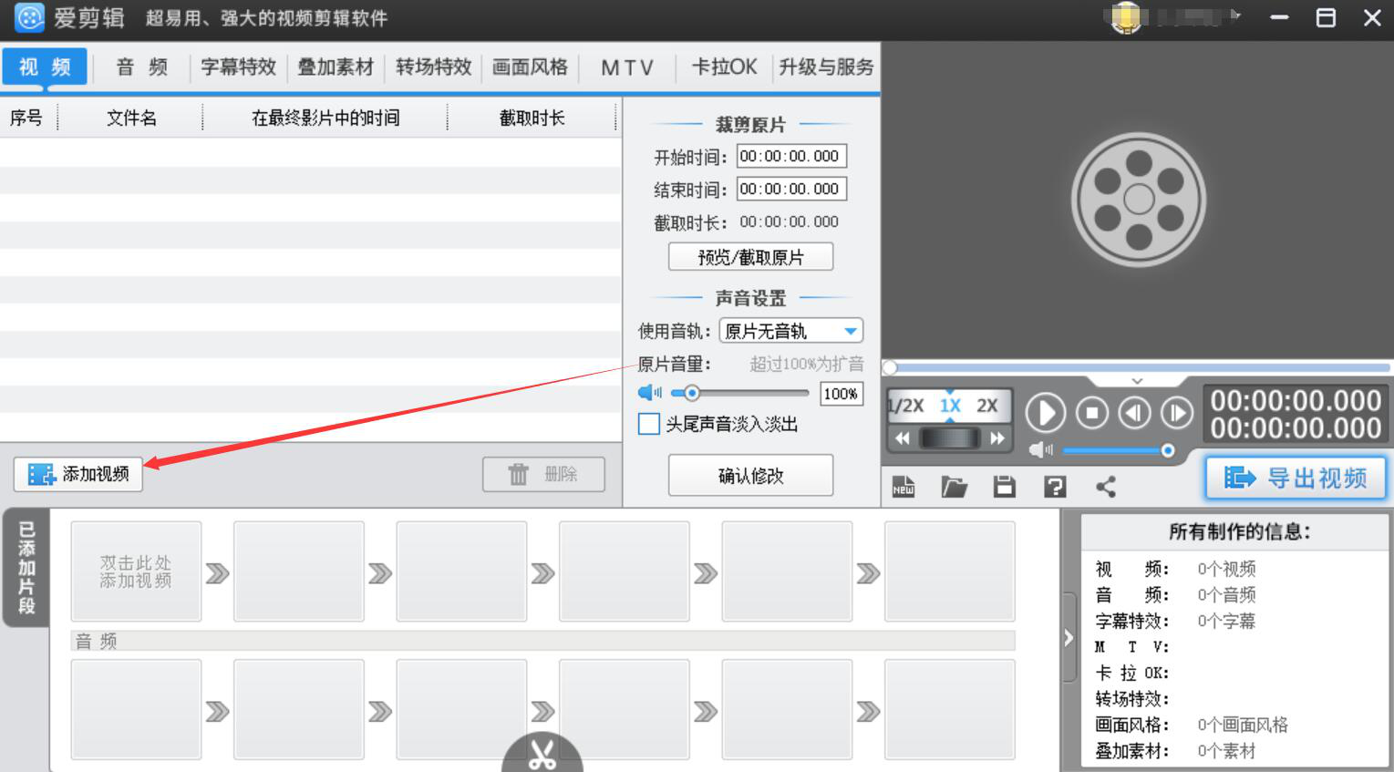 1、首先,我们打开爱剪辑的主界面,点击界面左侧的“添加视频”按钮。