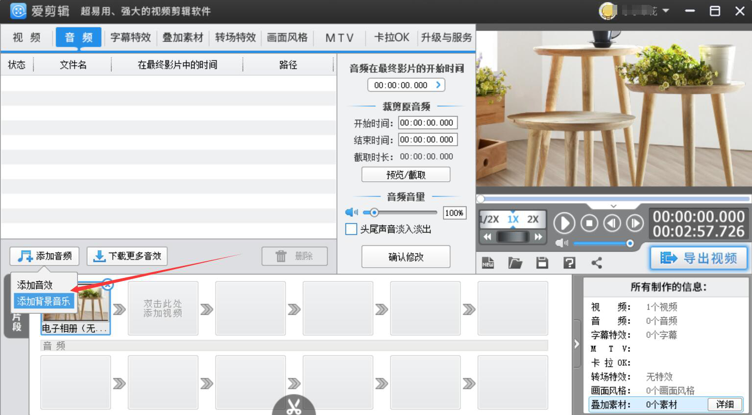10、我们点击切换至爱剪辑的音频操作界面,点击“添加音频”功能中的“添加背景音乐”选项,选择自己想要为电子相册添加的音乐。