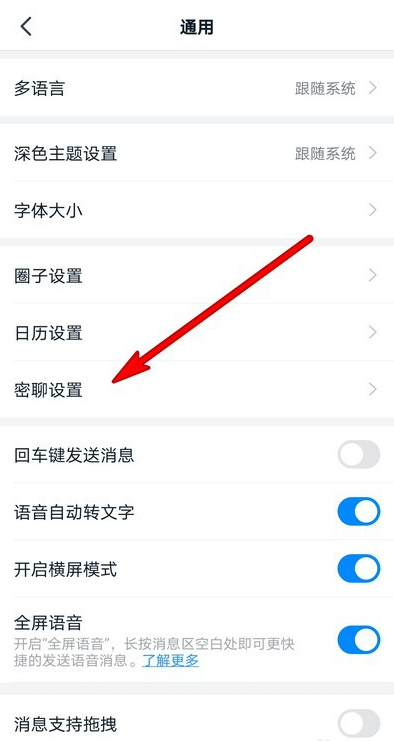 进入设置界面,如图,点击【通用】,选择【密聊设置】,