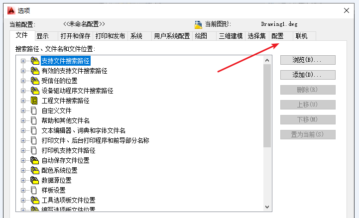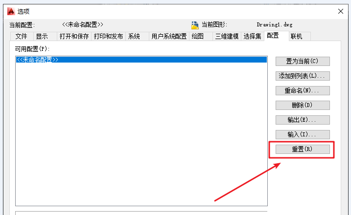 弹出选项设置窗口,点击【配置】,跳转至配置界面,在右侧栏点击【重置】命令,如图,