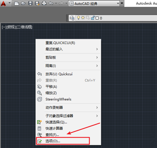 如图,使用鼠标右击CAD界面空白部分,弹出菜单,点击【选项】,
