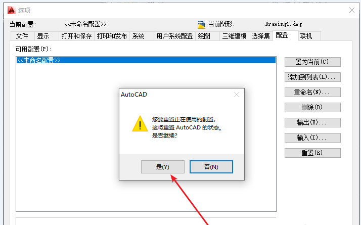 出现提示框,如图,即将重置AutoCAD的状态,点击【是】,