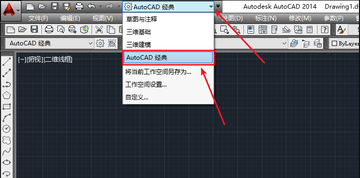 我们还可以通过切换CAD的工作环境来调出工具栏,如图,点击小三角展开CAD的工作环境,选择【AutoCAD经典】,