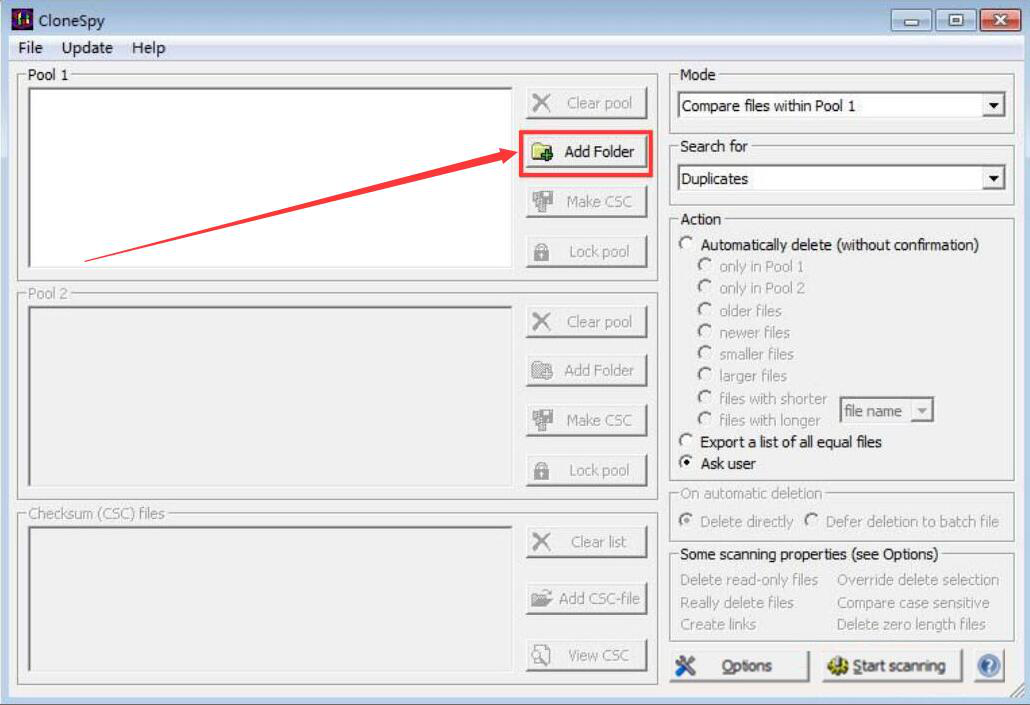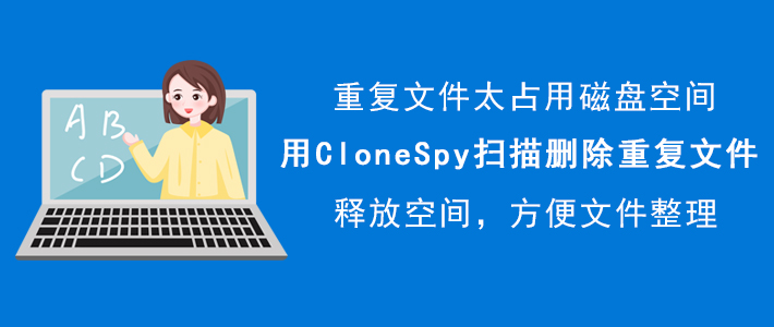 电脑中重复文件比较多的话,会很占用磁盘可用空间,为了释放空间和文件归类,我们可以CloneSpy扫描并删除重复文件。