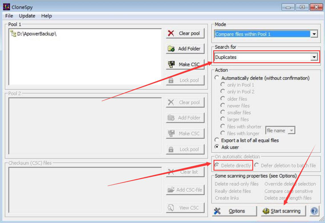 4、接下来,我们在CloneSpy右侧界面中的“Search for”扫描中选择“Duplicates”重复文件选项;并点选“Delete directly”直接删除选项,再点击界面右下方的“Start scanning”按钮,CloneSpy便开始扫描重复文件。