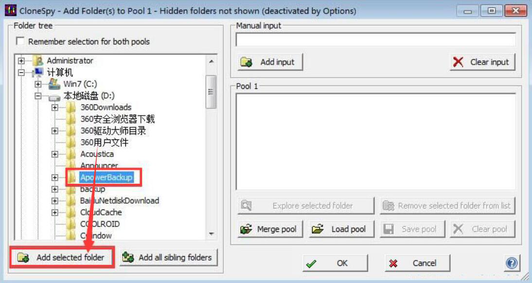 2、然后,我们从CloneSpy的左侧文件列表中,点击想要扫描删除的重复文件夹,再点击“Add selected folder”按钮。