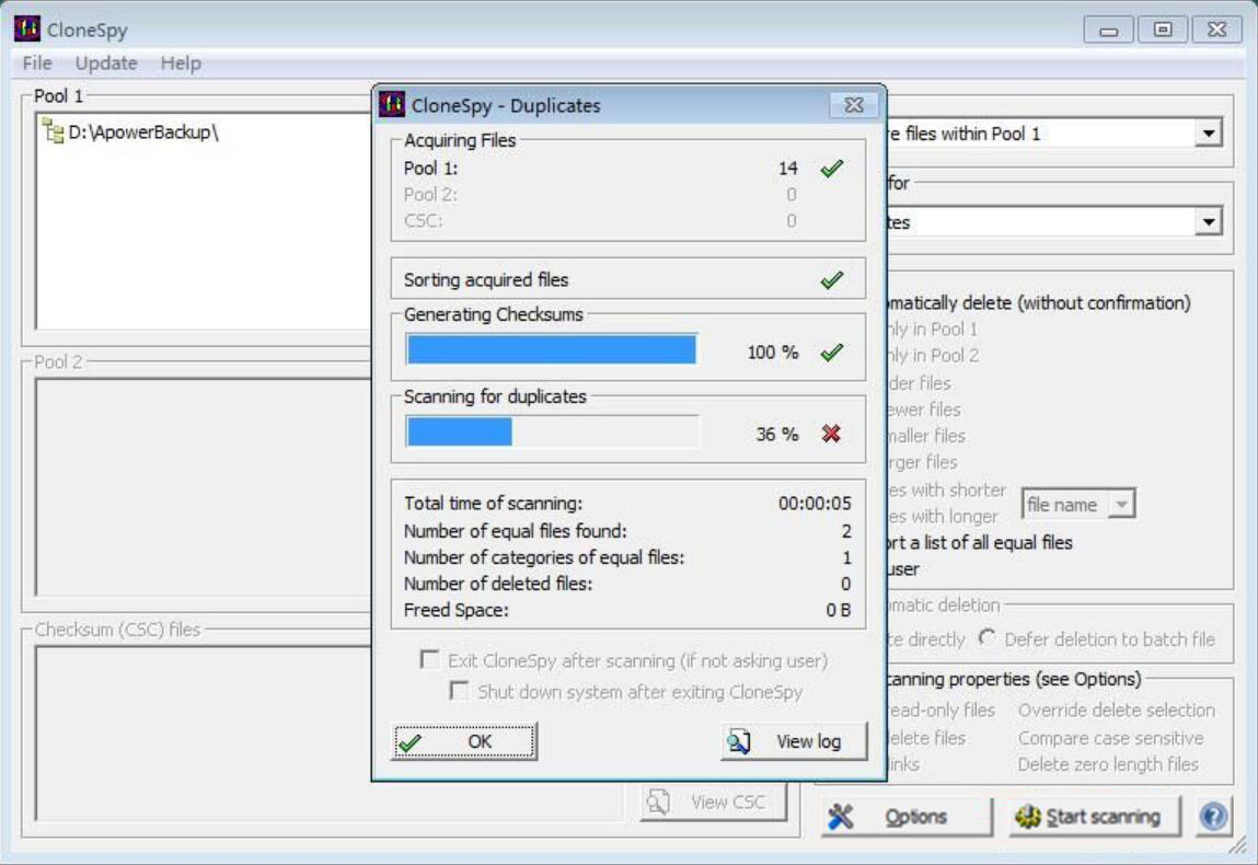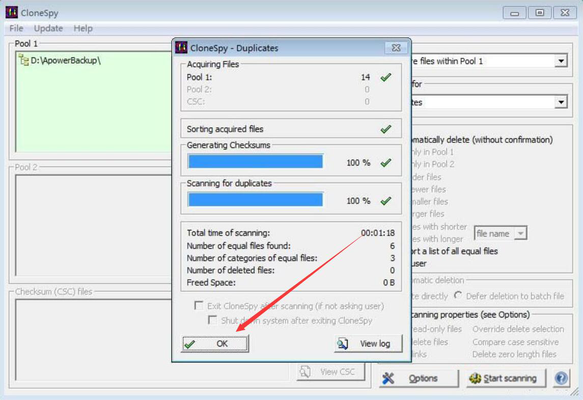 8、最后,回到CloneSpy扫描重复文件窗口,点击“OK”按钮,CloneSpy即完成扫描删除重复文件的命令。