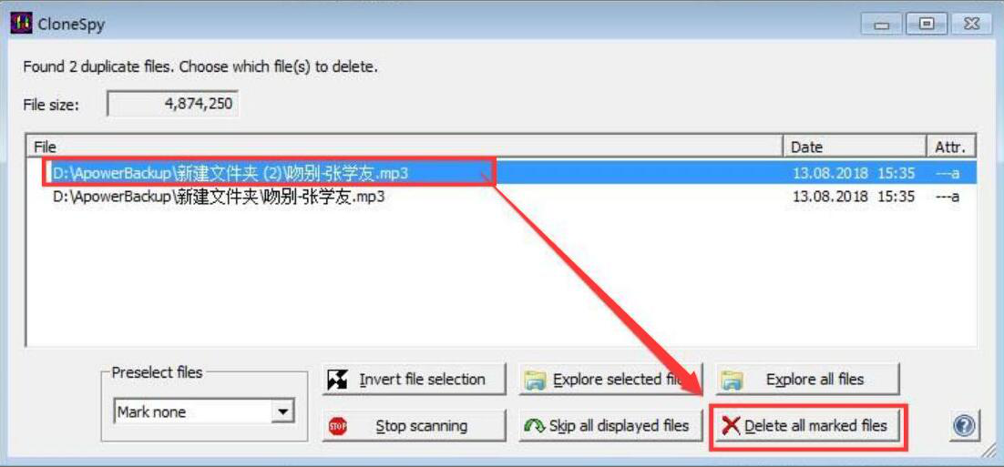 6、当重复的文件扫描完成时,CloneSpy会弹出如下窗口展示重复的文件。我们单击想要删除的重复文件,再点击“Delete all marked files”按钮将重复的文件给删除。