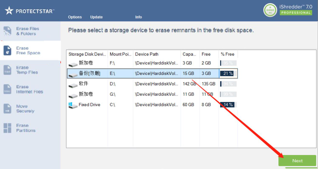 2、然后,我们单击选择想要iShredder释放的磁盘空间,再点击界面右下方的“Next”按钮。