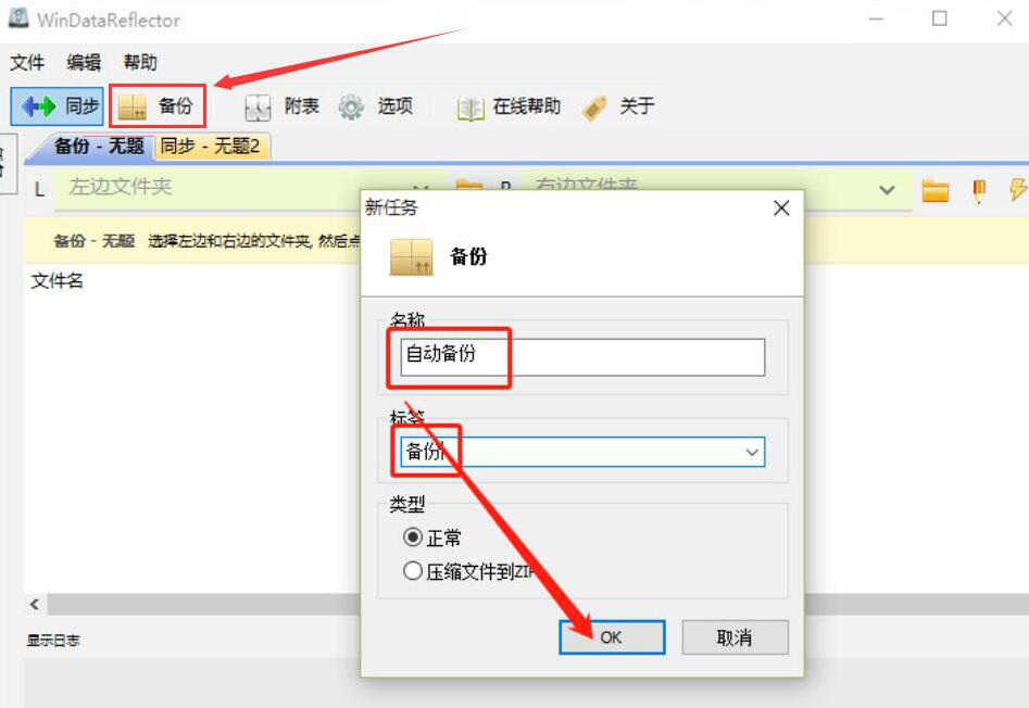 1、首先,我们打开WinDataReflector,点击界面左上方的“备份”按钮,并在弹出的新任务窗口中,输入电脑文件备份的名称、标签和选择类型,再点击“OK”按钮。