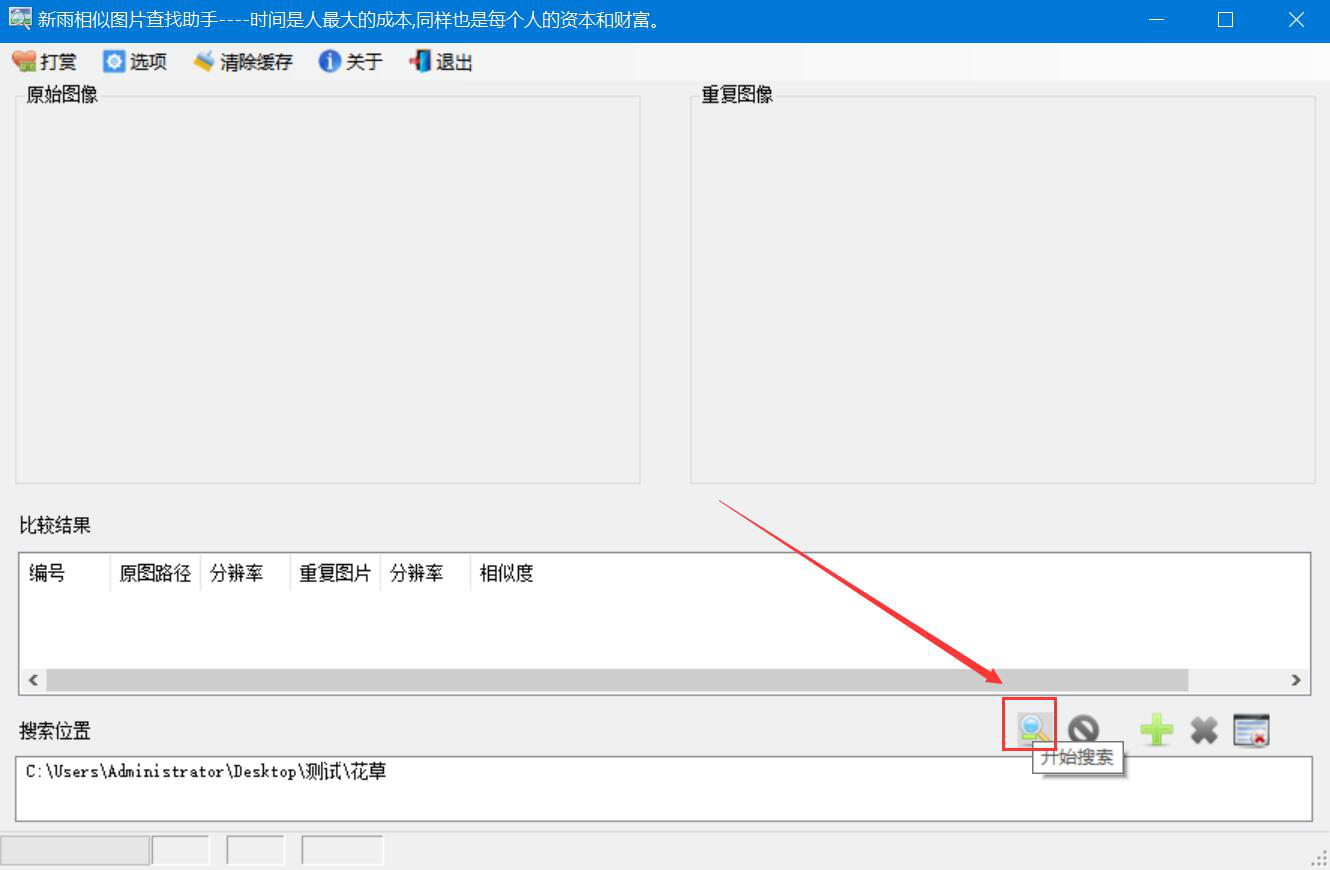 3、然后,回到软件操作界面,我们点击界面右下方的“开始搜索”按钮,新雨相似图片查找助手便开始搜索该文件夹中的重复图像了。