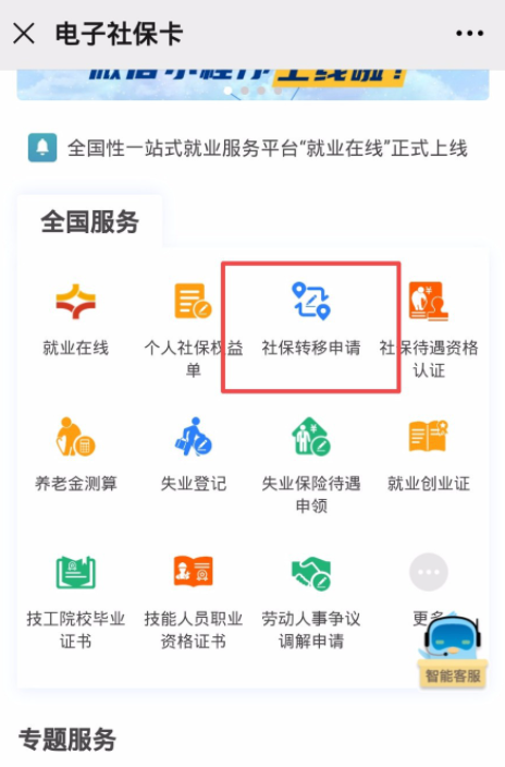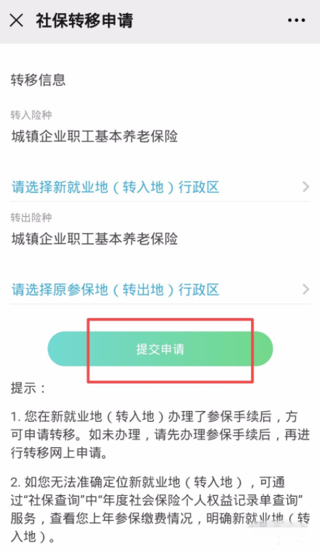 如图,点击【全国服务】——【社保转移申请】,按照要求填写相关信息,最后点击【提交申请】即可。
