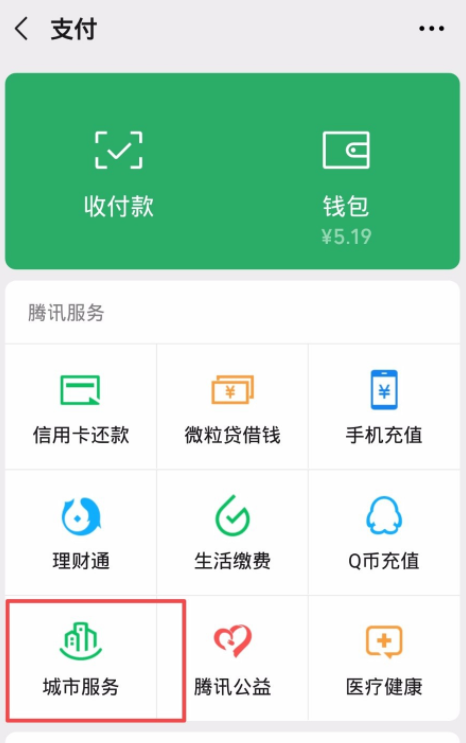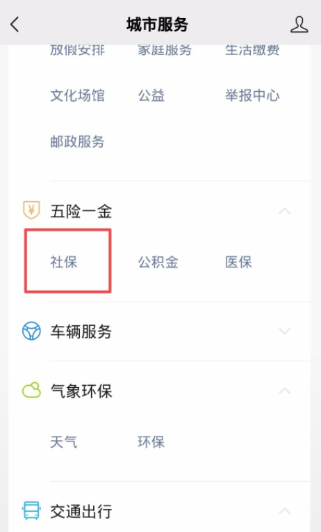 进入支付页面,点击【城市服务】功能,如图,选择【社保】,