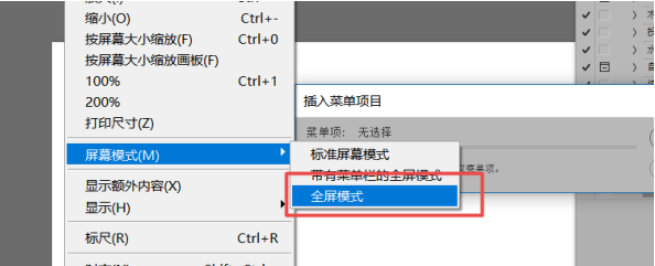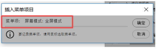 要想插入菜单栏上的项目动作,系统是无法记录的,需要插入菜单项目,然后点击全屏模式,