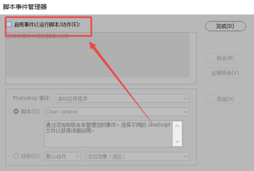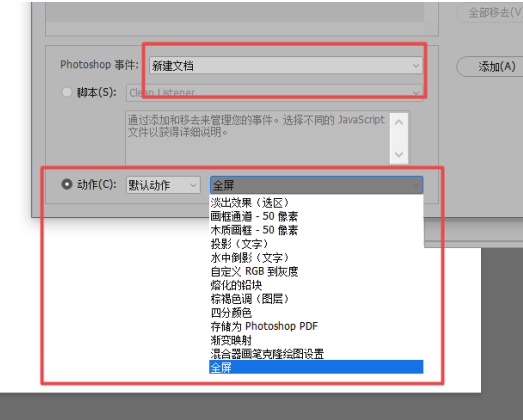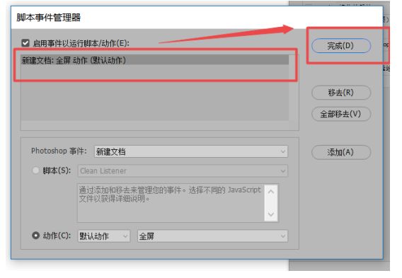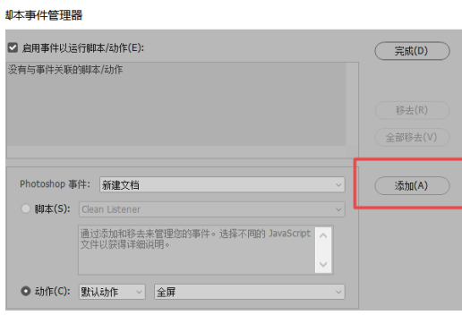 添加全屏动作完成,停止动作,打开脚本事件管理器,选择Photoshop事件为新建文档,设置动作为【全屏】,点击【添加】——【完成】,