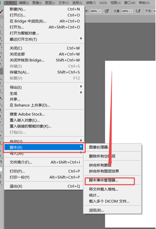 进入PS操作窗口,在上方菜单栏点击【文件】——【脚本】——【脚本事件管理器】,