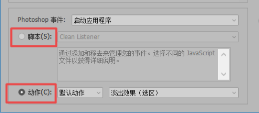 在下方点击【脚本】或者【动作】,例如设置Photoshop事件为启动应用程序,那么就会执行一个淡出效果的动作,