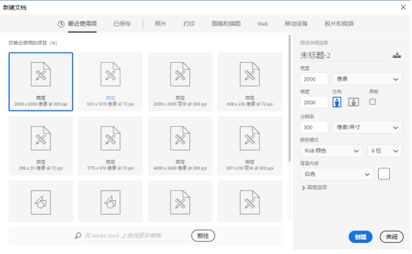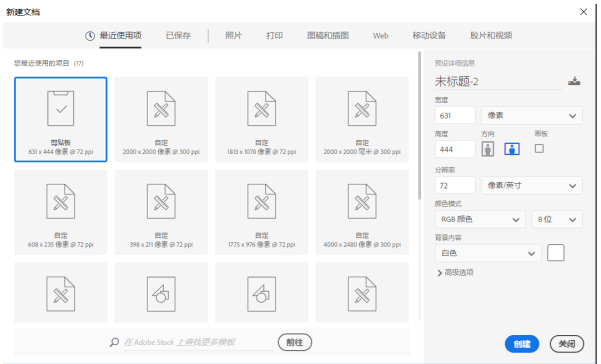 打开Photoshop软件,进入界面,如图,点击【自定】,新建一个文件,