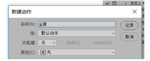 现在来做一个打开全屏模式的脚本事件,要先记录全屏动作,在PS菜单栏点击【窗口】——【动作】,出现弹窗,设置名称为【全屏】,新建动作,