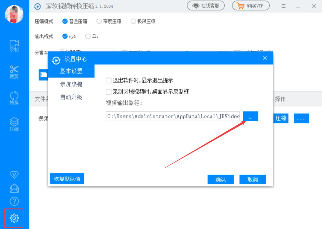 4、接下来,在家软视频转换压缩软件中,我们点击左侧栏下方的“设置”齿轮按钮进入设置中心,如果视频压缩后的输出路径需要更改,就点击如下图的“…”按钮。
