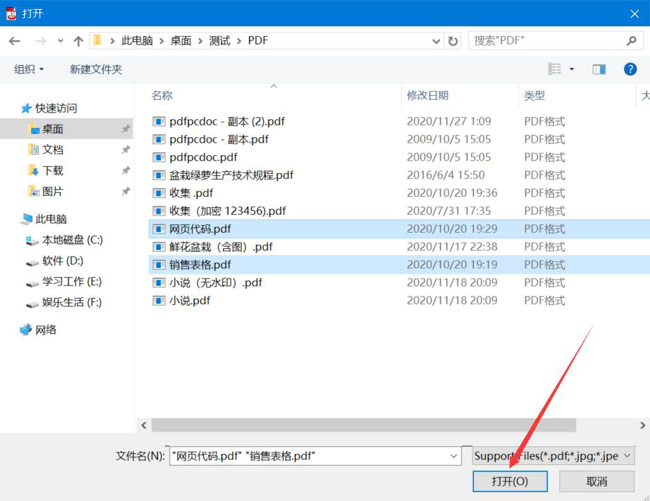 2、然后,在弹出的窗口中,我们选中需要合并的PDF文件,并点击“打开”按钮,将其一并导入PDFMate Free PDF Merger软件。