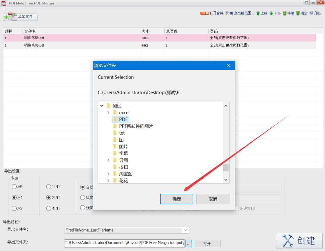 5、此时,PDFMate Free PDF Merger会弹出浏览文件夹窗口,我们选择PDF文件合并后的输出路径,再点击“确定”按钮。