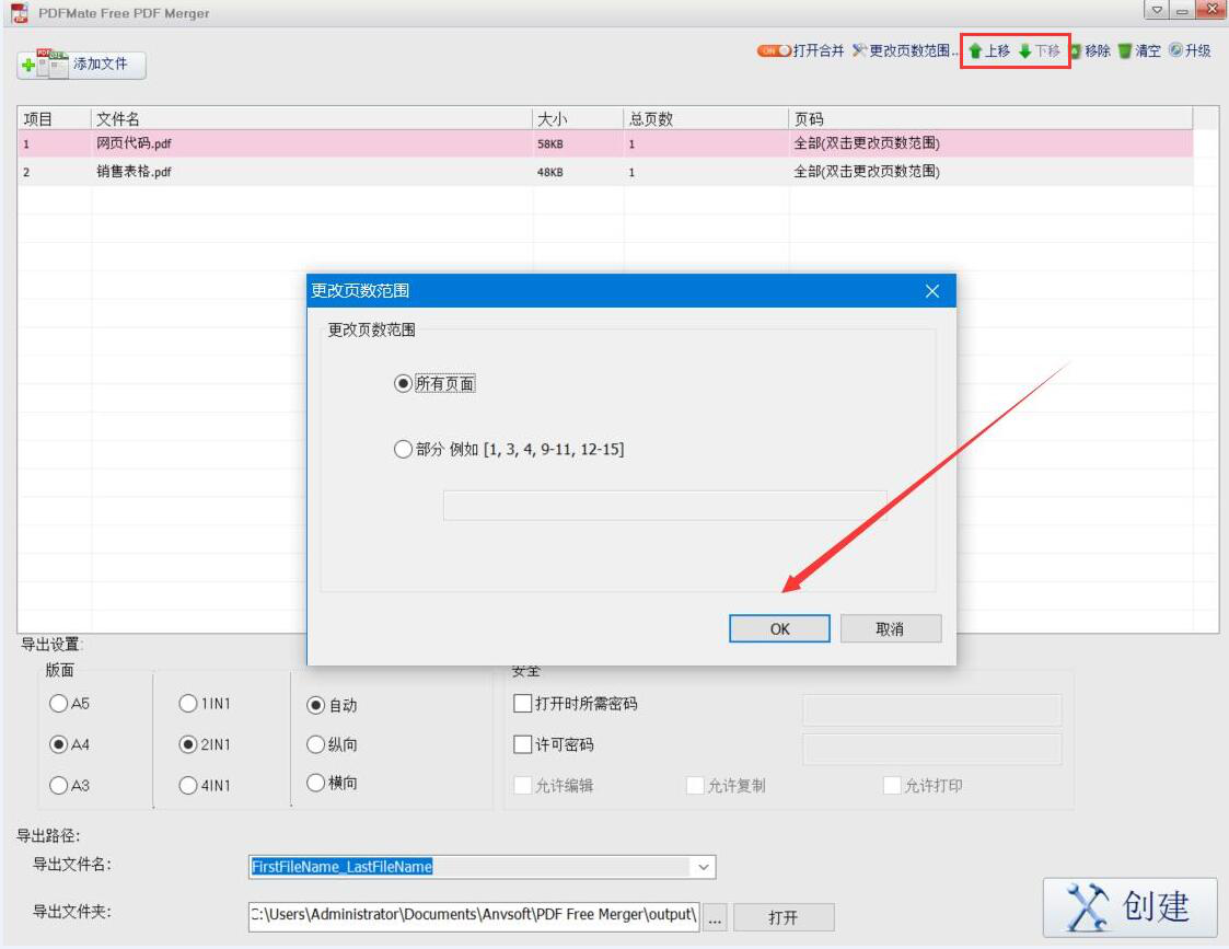 3、接下来,我们单击选中PDF文件,并点击PDFMate Free PDF Merger界面右上方的“上移”、“下移”按钮即可对PDF文件进行排序。而双击PDF文件,则会弹出更改页数范围的窗口,我们可以选择所有页面合并,也可以设置部分页面合并,设置完成,再点击“OK”按钮。