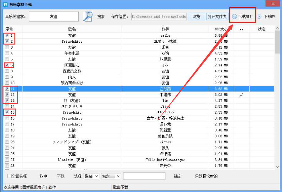 5、最后,我们将需要下载的网络歌曲一并勾选,再点击界面右上方的“下载MP3”按钮,固乔视频助手便会将所选的网络歌曲一并下载。